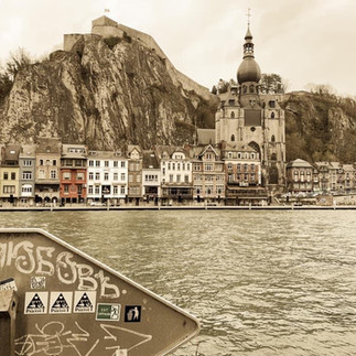 Ons bezoek aan Dinant heeft goed en wel een ontluisterend lang anderhalf uur geduurd. Maar we geven het niet op. We zijn te ver gekomen, om niet voor all in te gaan. We rijden verder, in bochten langs de Maas. Breed stromend, grijsgroen gekleurd, onder de ogen van Vier Heemskinderen.